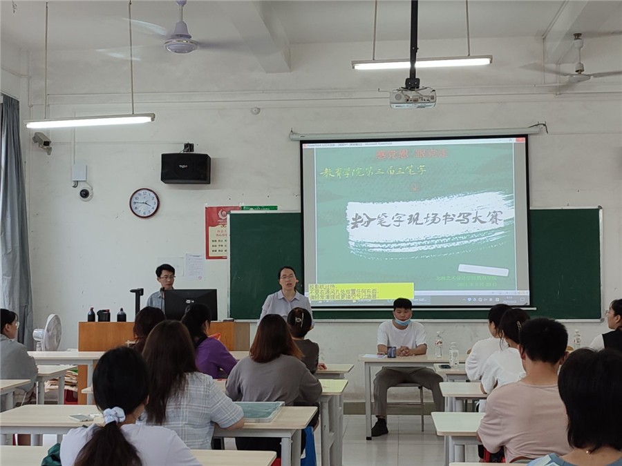 为庆祝建党100周年,激发学院学生的爱国爱党热情,提高学生的专业水平,5月22日,教育学院在东校区1号楼202教室举办了以“感党恩,跟党走”为主题的第三届三笔字之粉笔字大赛。教育学院副院长熊秀峰出席本次大赛,环艺学院副院长唐道明、教育学院副院长苏乃从、书法协会指导老师江威龙担任本次大赛评委。