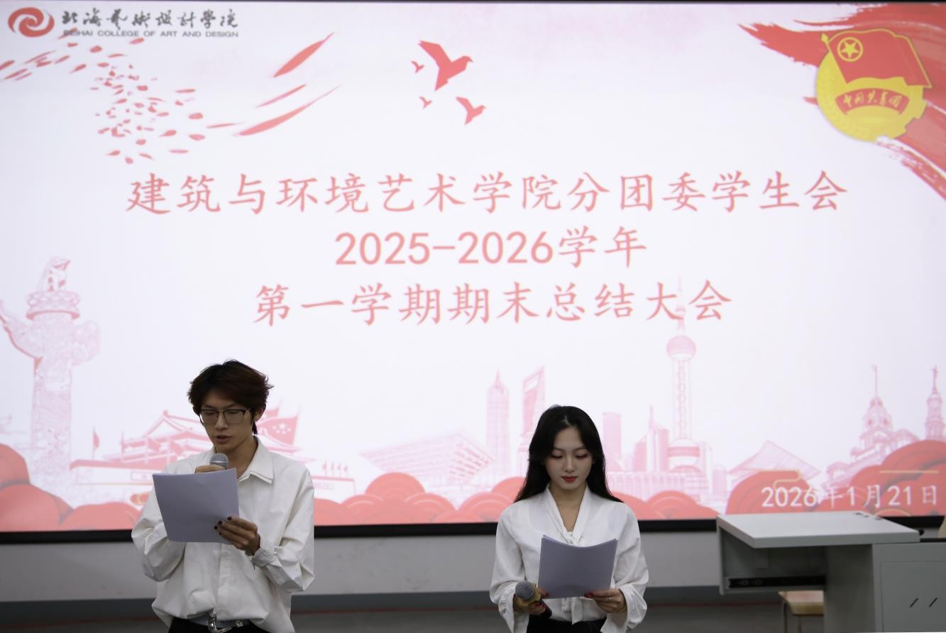 2026年1月21日,为全面复盘工作、总结经验、明确方向,建筑与环境艺术学院分团委学生会期末总结大会在公德楼107教室顺利召开。建筑与环境艺术学院党总支书记庞定坤、副院长张乐平、分团委书记赵晓盼、学生第一党支部书记刘杰、学生第二党支部书记兼分团委副书记陈宣辰莅临指导,分团委学生会主席团及全体成员齐聚一堂,共话成长与收获。