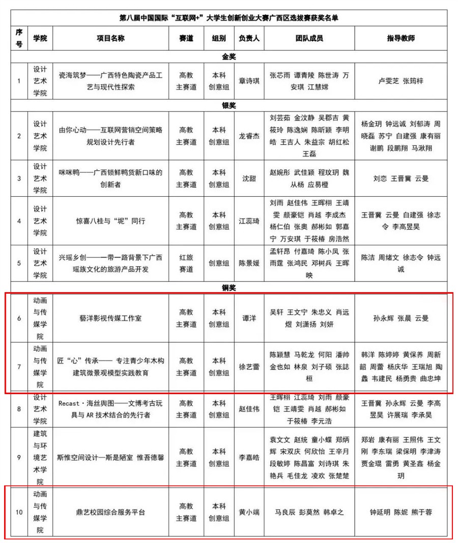 近日,广西壮族自治区教育厅发文公布了第八届中国国际“互联网+”大学生创新创业大赛“数广集团杯”广西赛区选拔赛获奖名单,北海艺术设计学院斩获金奖1项、银奖4项、铜奖17项的佳绩。
