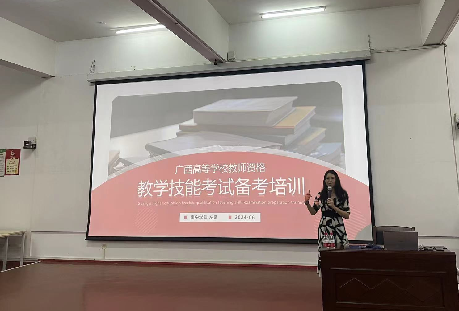 为增强我校教师高校教师资格证技能考试应试技巧,提高高校教师资格证技能考试通过率,6月7日下午,人事处(教师发展中心)邀请广西高等学校教师资格教学技能考试测试专家、FDW国际认证教学技能引导员左婧为我校今年参加高校教师资格证技能考试的教师开展了“高校教师资格证技能考试专题培训”。本次培训地点设在西校区伦理楼107,由人事处处长屈志鑫主持,各学院/部门共90余位教师参加本次培训。