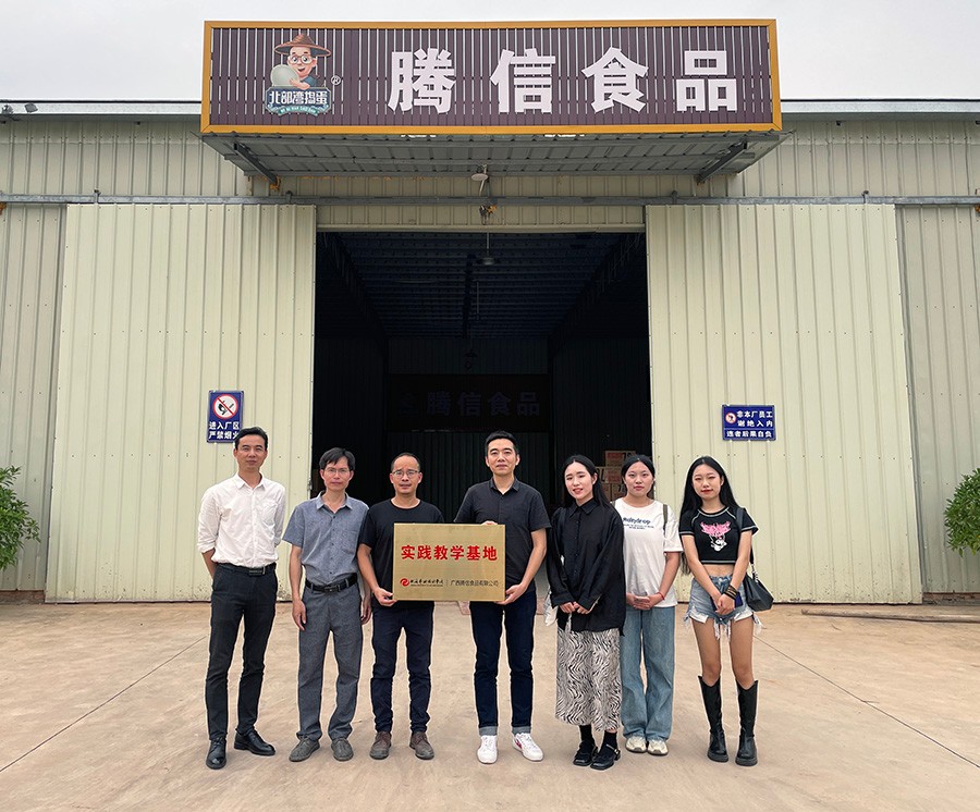 2023421日第一党总支(设计艺术学院)书记黄锦、教研室主任张志、课程负责人郭梦楠与学生代表赴广西腾信食品有限公司开展实地考察暨签约揭牌活动。