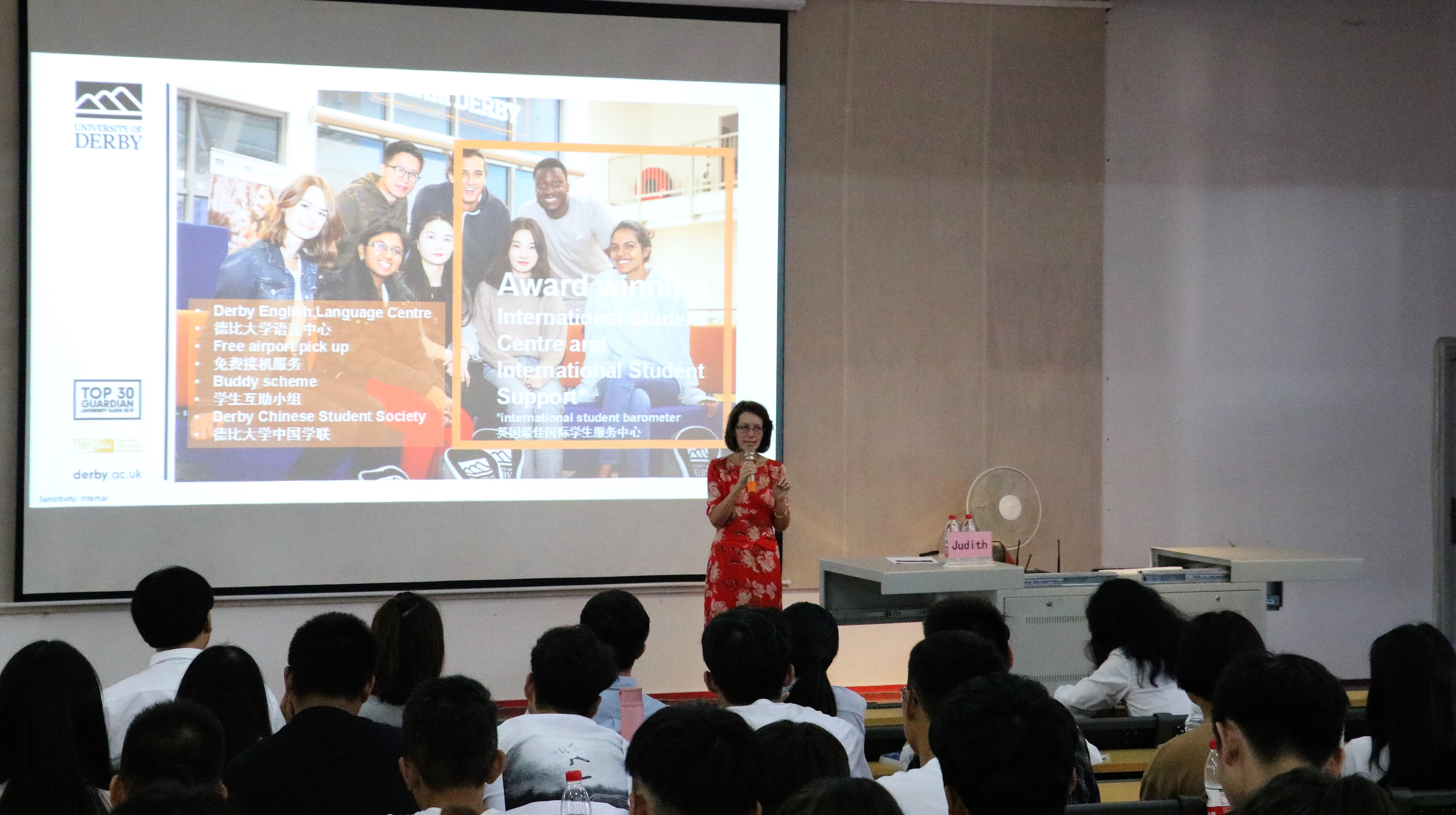 伴随着热烈的掌声,Judith常务副校长向大家带来诚挚的问候。她首先介绍了德比大学位于文化历史遗产丰富的德比郡,周边有国家公园和游乐场等设施。而后依次介绍了教育学院、商学院、自然科学学院、工程学院等,各个学院都获得过良好的成绩。学校开展校企合作使其就业率达到96%,给学生更好的提供了实习机会发展空间,让学生寻找更广阔的舞台。