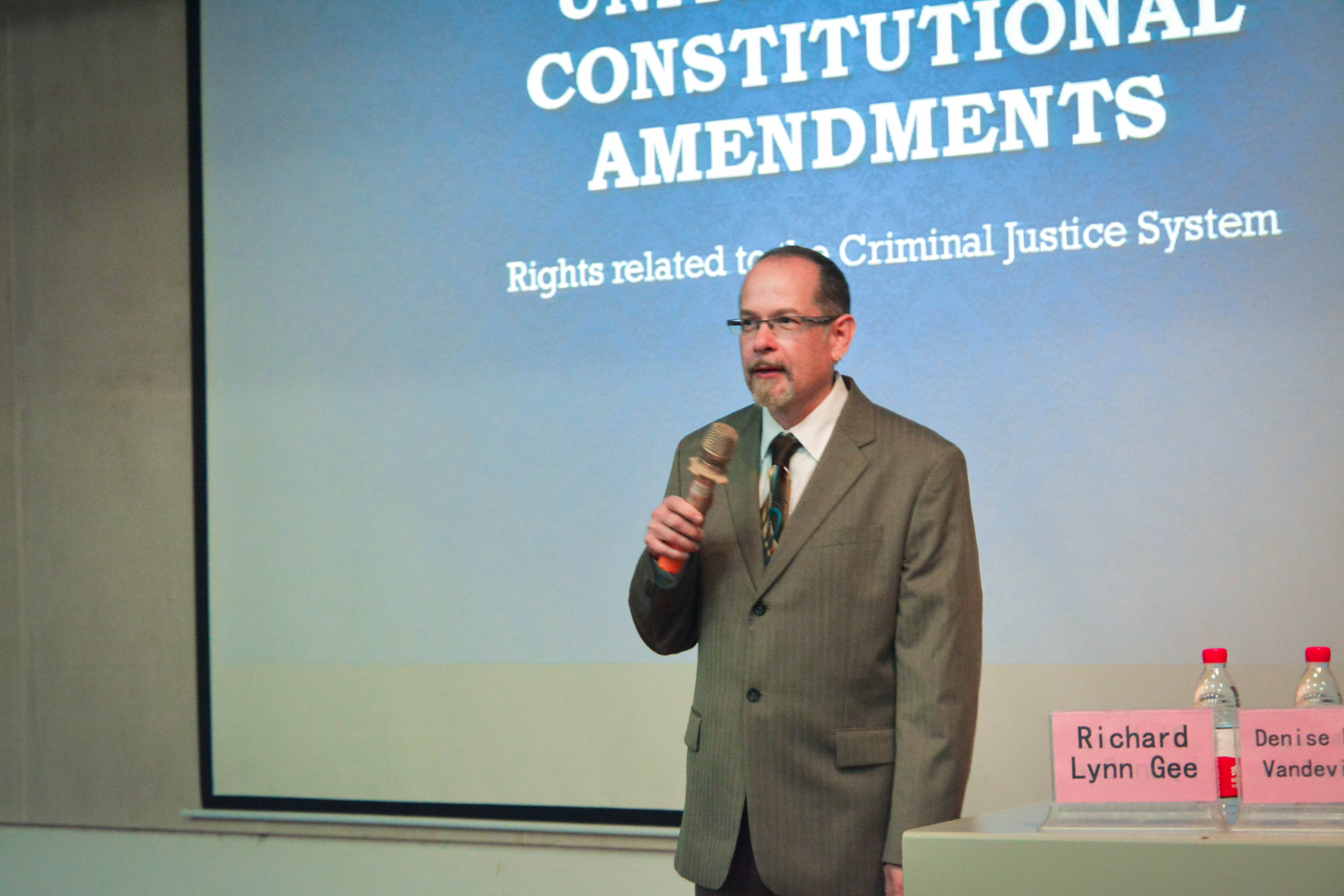 讲座开始,Richard Lynn Gee教授首先讲述了美国宪法修正案关于公民、居民、学法的人权问题,同时提到自由言论、自由抗议权等可做与可不做的hate speech等问题。Richard Lynn Gee教授通过宪法上所出现的案件事例让同学们更加清楚的了解到宪法的用处,同时通过持枪权、自由权、审判权、人权阐述了在美国所享有的权利和义务,也使我们深刻体会到美国文化与中国文化的差异,使得在场师生对于美国文化有更进一步的了解与认识,也加强了我们对美国宪法的认识与运用。Richard.Lynn Gee教授也提醒同学们如何在法律的基础上去保护好自身的权利并积极履行公民的义务。