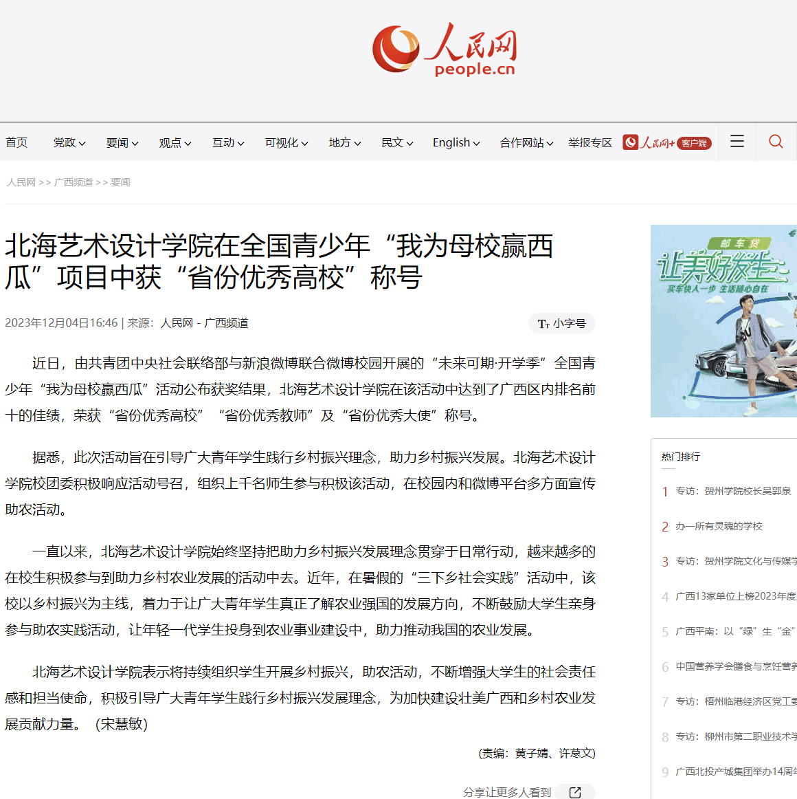人民网:北海艺术设计学院在全国青少年“我为母校赢西瓜”项目中获“省份优秀高校”称号