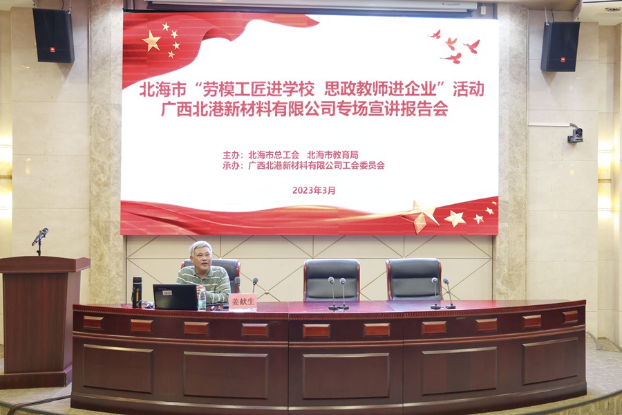 为大力弘扬劳模精神、劳动精神、工匠精神,充分发挥劳模工匠榜样示范作用和思政教师的专业优势,3月16日,由北海市总工会、北海市教育局主办的“劳模工匠进学校 思政教师进企业”宣讲报告会活动走进北港永不锈书院。我院院长姜献生教授应邀到企业进行现场宣讲,来自北港新材料各条战线的劳模工匠先进代表及一线职工代表80余人到场聆听。