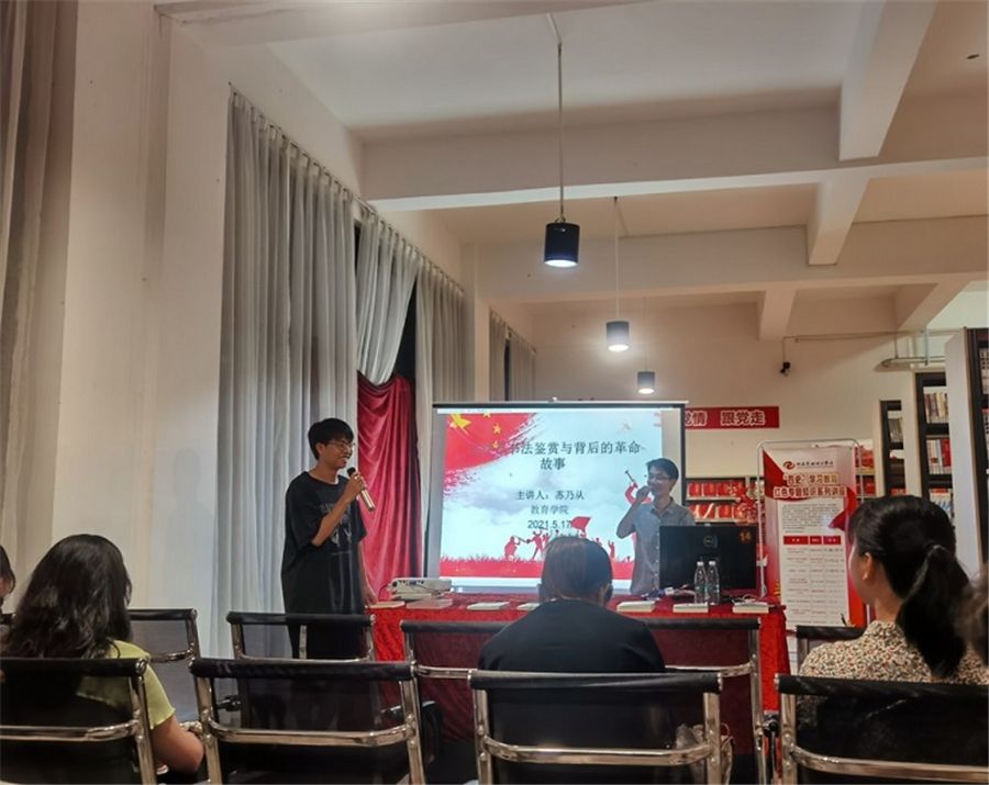 “四史”学习教育红色专题知识系列讲座得到了学校领导、图书馆、教育学院、美术学院等部门的大力支持。活动历时一个月,7位来自不同学院的老师分别从党史、军史、美术、音乐、舞蹈、书法等角度作了专题讲座,分别为马克思主义学院院长姜献生教授的《“四渡赤水”与毛泽东的战争指挥艺术》和《中国革命的伟大史诗——长征》、马克思主义学院副院长罗秋梅副教授的《“三湾改编”与毛泽东的建军思想》、马克思主义学院王佳碧老师的《中国共产党与黄埔军校》、教育学院副院长苏乃从老师的《毛泽东书法鉴赏与背后的革命故事》、教育学院孙嘉昕老师的《品音乐——学党史》、教育学院莫丽蓉及8名同学表演的舞蹈《中国共产党百年瞬间——八女投江》、美术学院张湘中老师的《美术作品中的党史故事》。讲座内容结合了学生的专业特点,受到广大师生的热烈欢迎,在师生中引起的强烈反响。