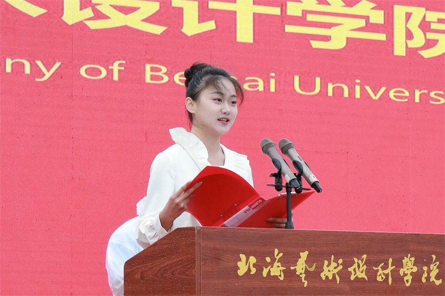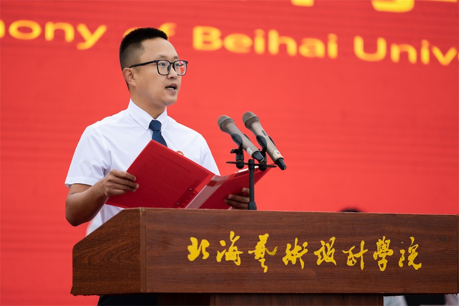 美术学院教师殷声代表全体教师,承诺会秉持教师道德操守,坚持走好育人之路,启迪新生学子珍惜大学时光,怀揣伟大青春理想,努力学习,勤勉奋斗,向着理想,健康成长,争做有思想、有智慧的北艺人。