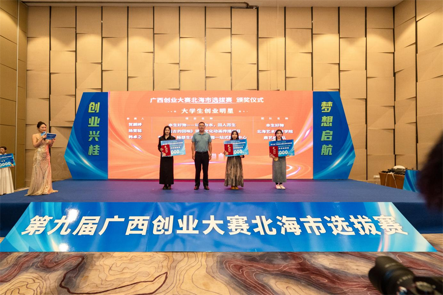 近日,由北海市人力资源和社会保障局、北海市教育局、北海市工商业联合会主办,广西众创空间联合会承办的第九届广西创业大赛北海市选拔赛在北海富丽华大酒店举办。历经激烈角逐,大赛最终共决出四个赛道各奖项。我校学生参赛项目“本生好物——以人为本,因人而生” “《远古的回响》瑶族文化动画传播项目”“专注学生 畅想生活——鼎艺校园一站式服务中心”分别斩获“大学生创业明星评选专项赛”赛道的一、二、三等奖。其中排名前二的项目将代表北海市参加下一阶段的广西区赛。