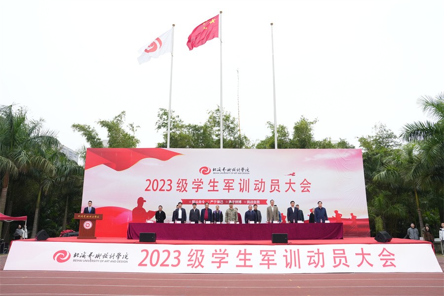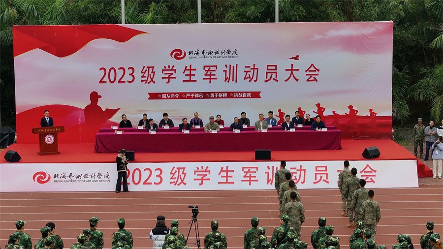 动员大会上,我校卢新华校长向北海海城区人民武装部领导授军训团团旗并宣布2023级学生军训开训。(周小琪、郭松、王弘武、周雨晨、高闻雨、相恒佳/摄)