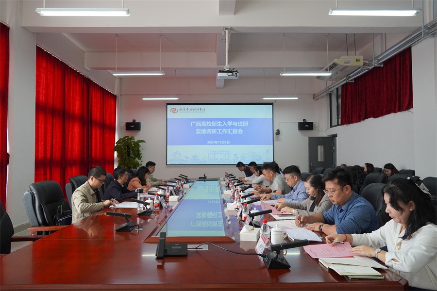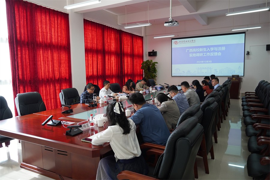 为规范学校新生入学管理和学籍注册工作,切实维护学生合法权益和高等教育公平公正,12月3日,由广西工商职业技术学院党委副书记安仲文一行4人到我校开展2024年新生入学与注册专项调研工作。我校副校长陶立阳、邱杰、何煜,以及各相关职能部门负责人参加会议,会议由学校党委副书记、政府督导专员陈毅华主持会议。