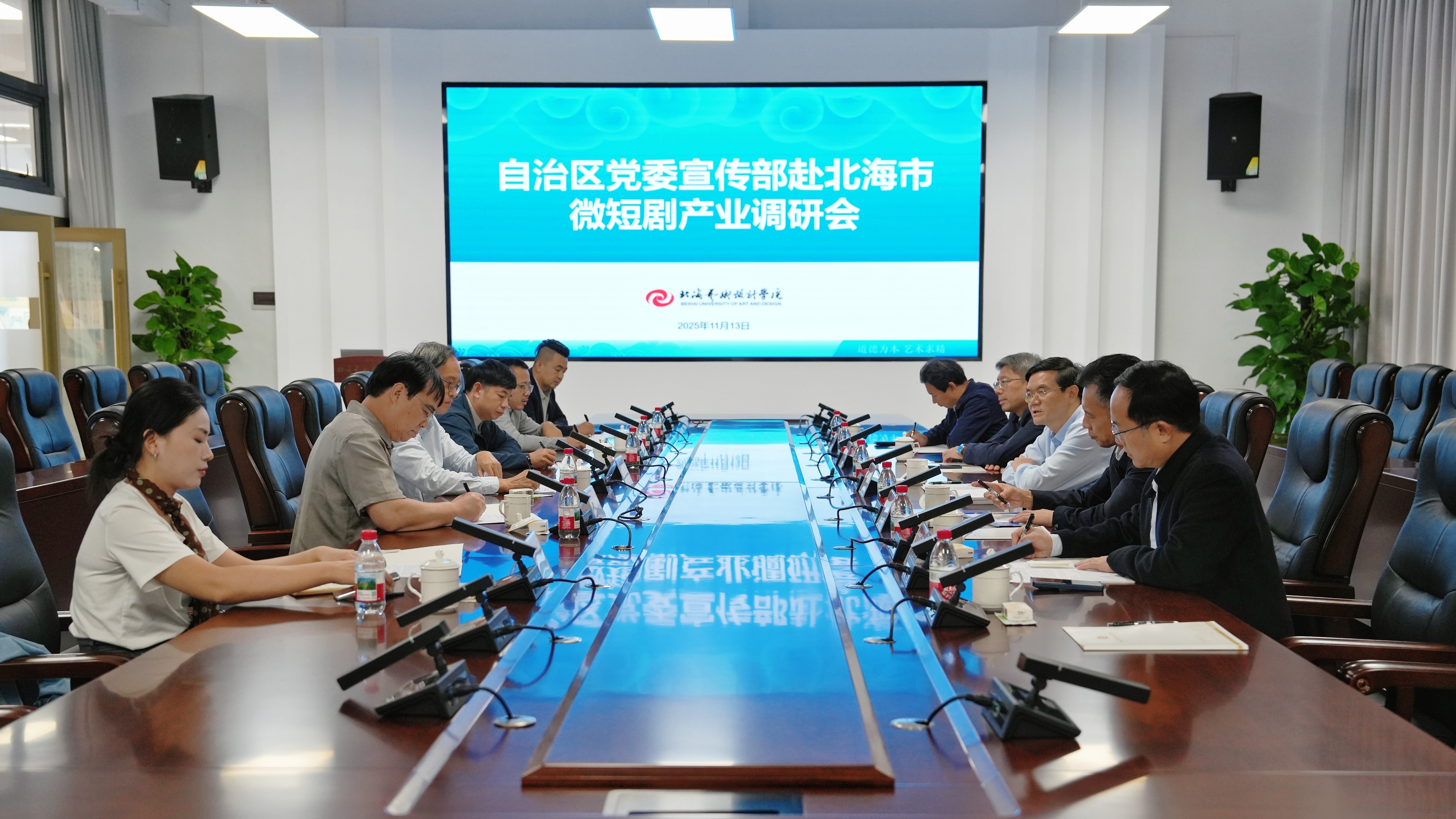 自治区党委宣传部副部长(兼),广电局党组书记、局长满昌学指出,近年来微短剧发展迅速,已成为影视产业新风口,自治区党委、政府高度重视微短剧创作生产,并先后出台系列扶持政策,将微短剧创作项目纳入自治区政府重点项目。近年来,北海艺术设计学院在硬件设施、学科建设、教学资源等方面均取得明显进步,为新业态下的人才培养和创作实践提供了坚实基础。满昌学部长强调,高校应顺应市场发展调整人才培养方向,围绕创作类、服务类等人才需求,研究优化人才培养结构,提升学生对新业态的适应能力;学校要积极参与微短剧创作与理论研究,依托艺术设计和影视动画等专业优势,推动AI与艺术创作融合,开展有深度、广度和传播力的作品创作,同时加强与地方部门对接,融入区域经济文化发展,积极参与北海市打造微短剧拍摄创作基地的规划,做好服务支撑,实现校地协同发展。此外,满昌学部长鼓励学校参与国家级赛事和智能创新赛道,特别是人工智能与艺术设计结合的场景应用,提升创新能力。
