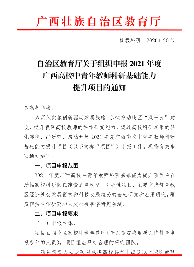自治区教育厅关于组织申报2021年度广西高校中青年教师科研基础能力提升项目的通知