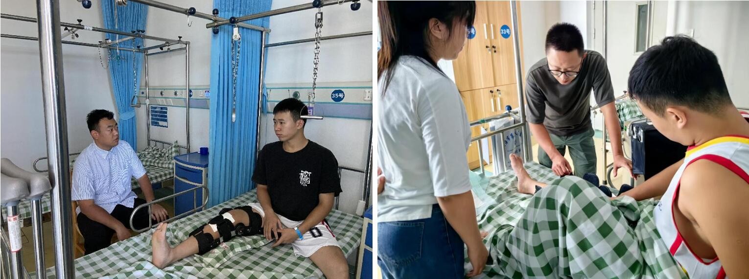 意外发生时,班主任及同学到场关心学生情况,协助其办理入住,9月6日,班级辅导员代表学校携带慰问金与学生家长一同缴纳治疗费用,并每日前往医院看望学生情况,带着同学们的祝愿鼓励学生配合治疗,早日回归校园。9月20日,学院领导鲁明阳接送学生出院,并联系学校安排一楼单人宿舍,方便学生行走和康复训练。