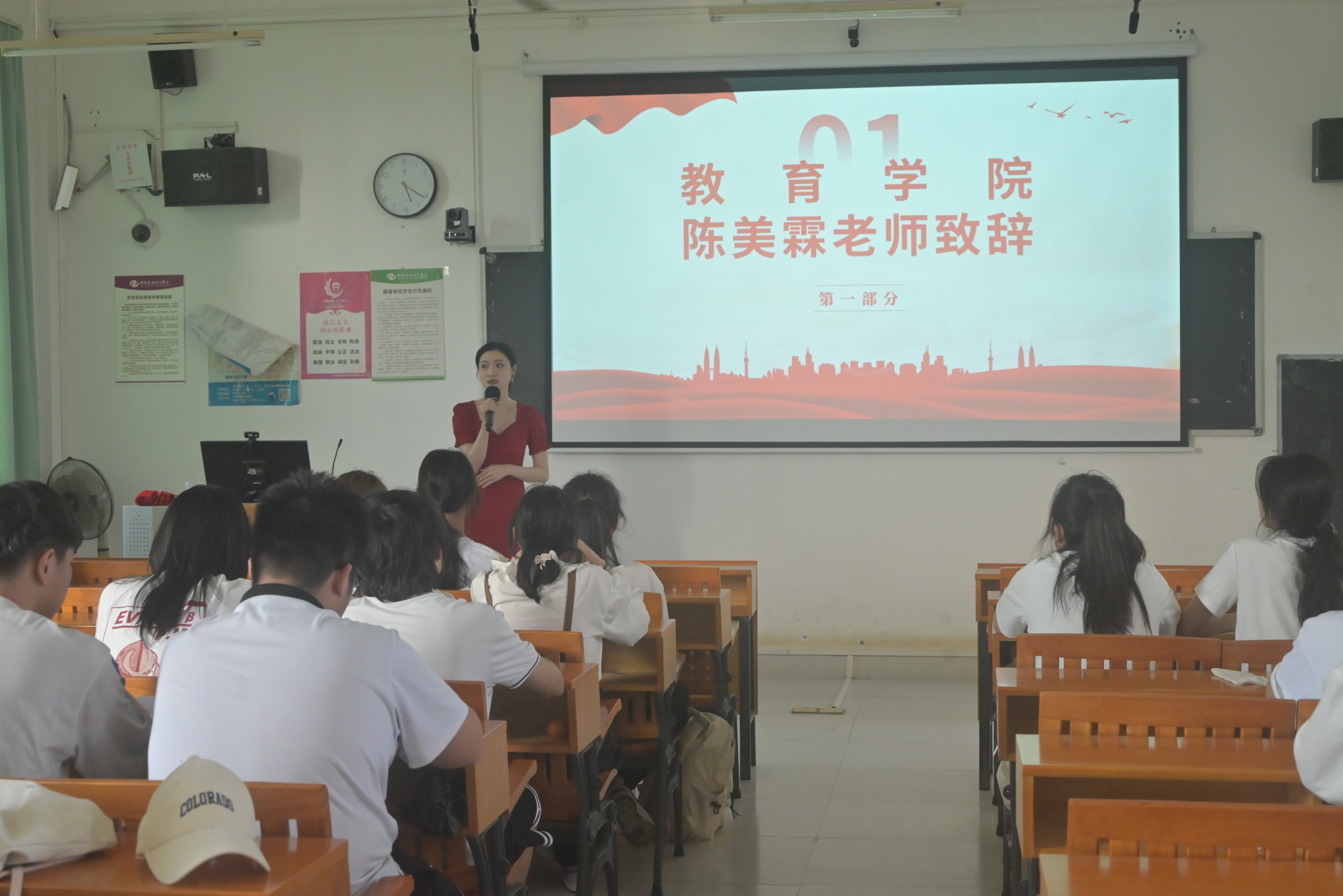 接着,教育学院团总支指导教师陈美霖发表致辞。她指出,“青马工程”的学习是一次全方位、深层次的成长淬炼。她希望同学们将理论学习成果转化为实践动力,把在青马工程中汲取的思想养分,运用到今后的学习、工作和生活中,以崇高理想为指引,勇担时代使命,在青春的赛道上跑出当代青年的最好成绩。
