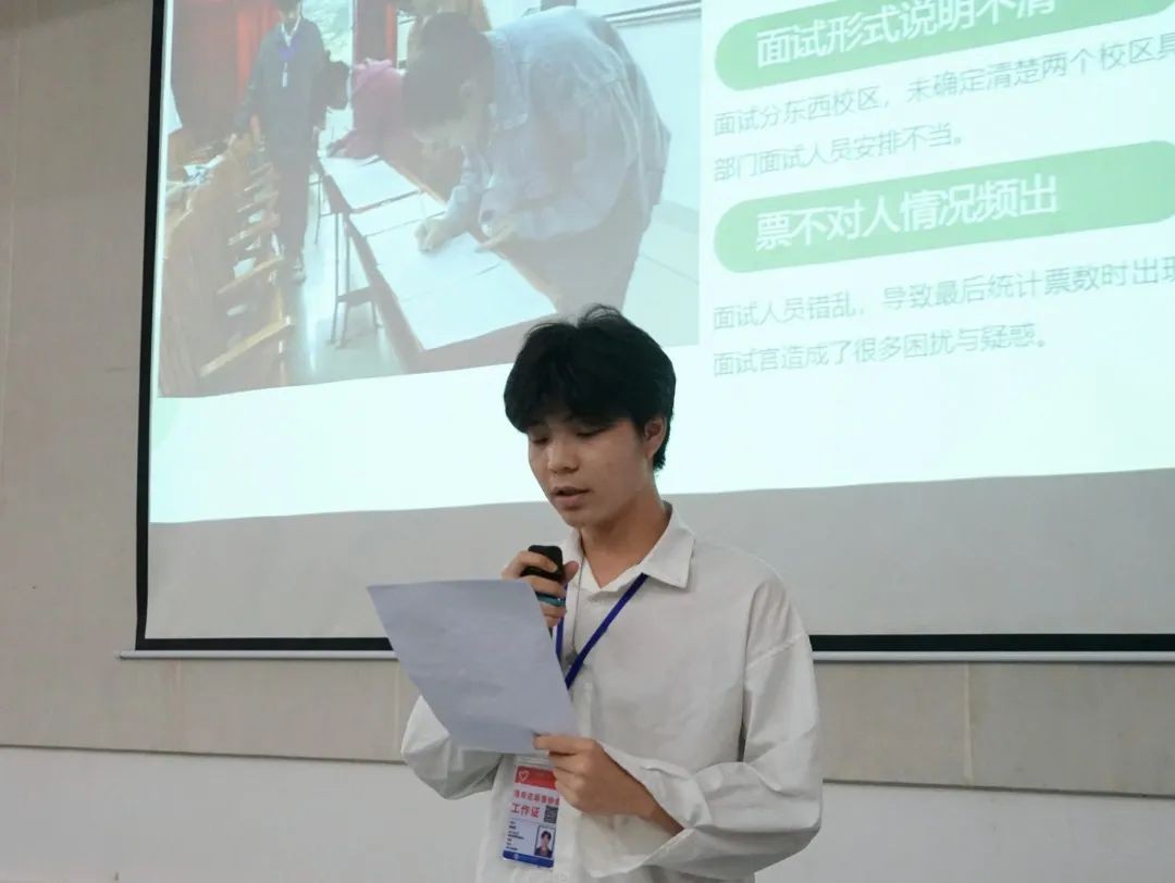 学生会主席团成员石冰杨睿代表学生会各个部门汇报相关工作,并对其做出了补充,以及提出了相关意见。表示在未来活动中,将积极创新,希望在以后的活动中以更创新的活动形式,吸引广大师生参与,丰富活动,使活动更加精彩。