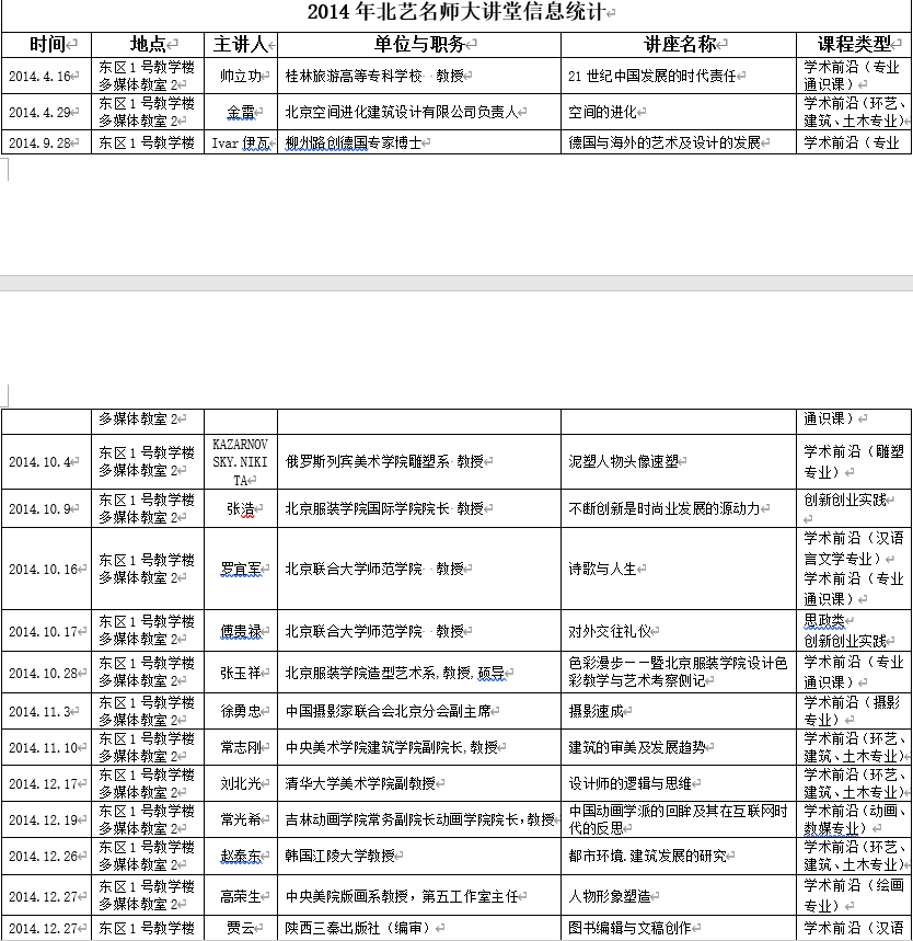 2014年北艺名师大讲堂信息统计
