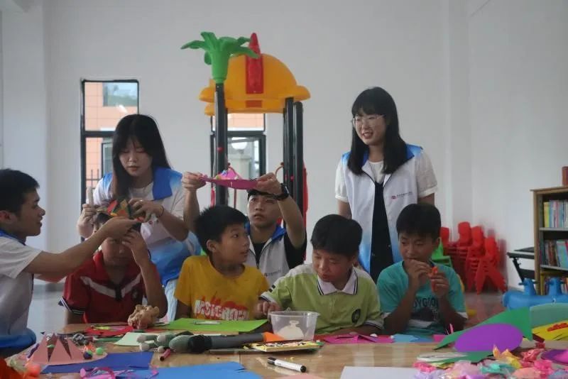 民族促进团史晓菲老师以《民族团结一家——多彩的民族》为授课题目,与当地社区五年级一班的学生一道,运用民族元素,利用涂、捏、粘、贴等方法共同了解纸浆画的制作过程。并且主动引导学生亲手将颜料,彩泥,饰品,与纸浆画相融合,通过巧妙搭配色彩、图案,制作出具有当地瑶族特色的民族饰品。