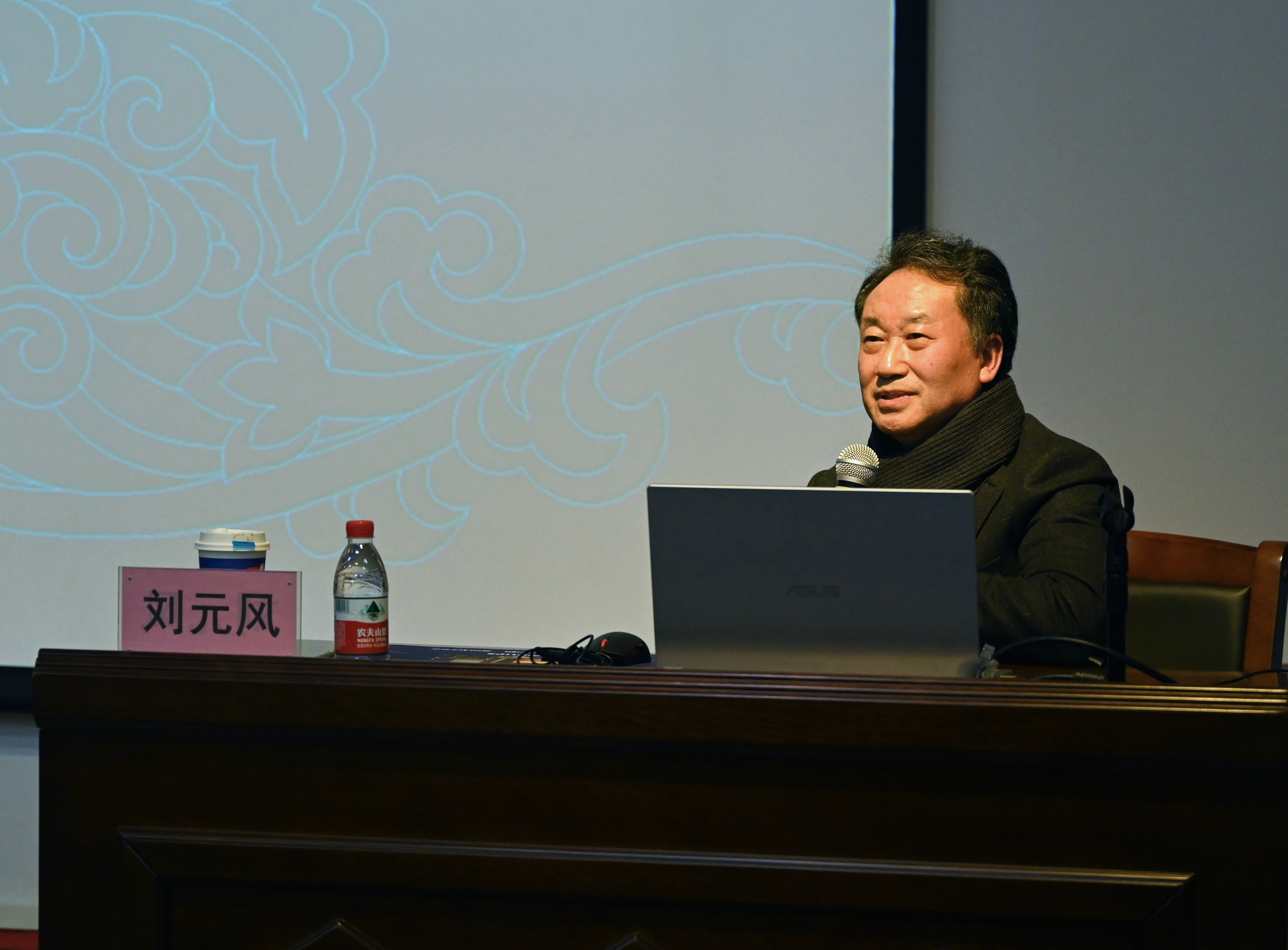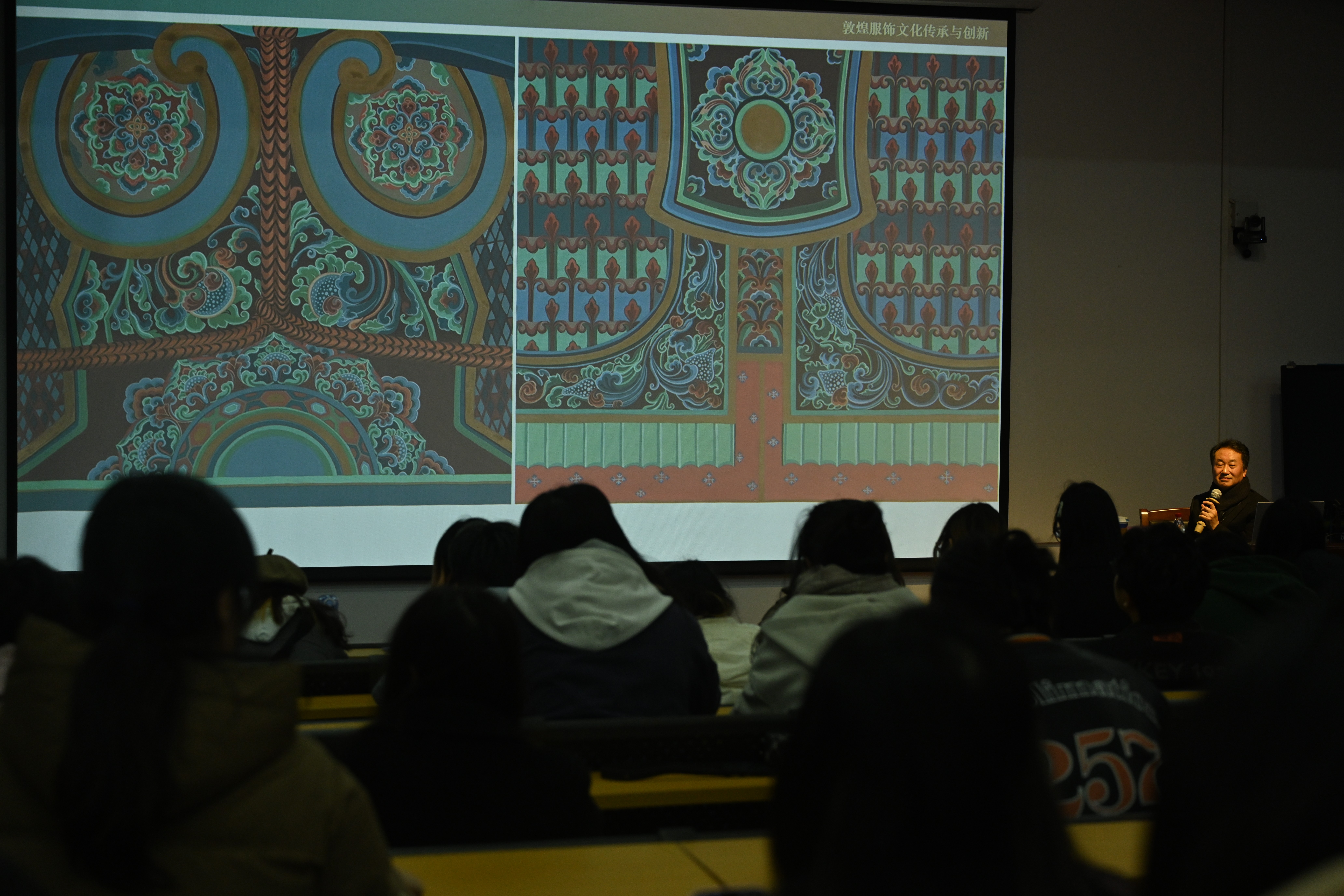 讲座伊始,刘元风教授以一张老照片讲述曾经求学的历程引入讲座内容。他通过展示与敦煌有关的图案以及敦煌彩窟菩萨裙饰在现代布料与现代服装上的应用,讲述他运用敦煌纹样设计的作品参加香港时装文化节,运用莫高窟盛唐第31窟藻井图案中的汲取元素所设计的工作服等丰富的工作经历,具体讲解了敦煌服饰的艺术与传承。