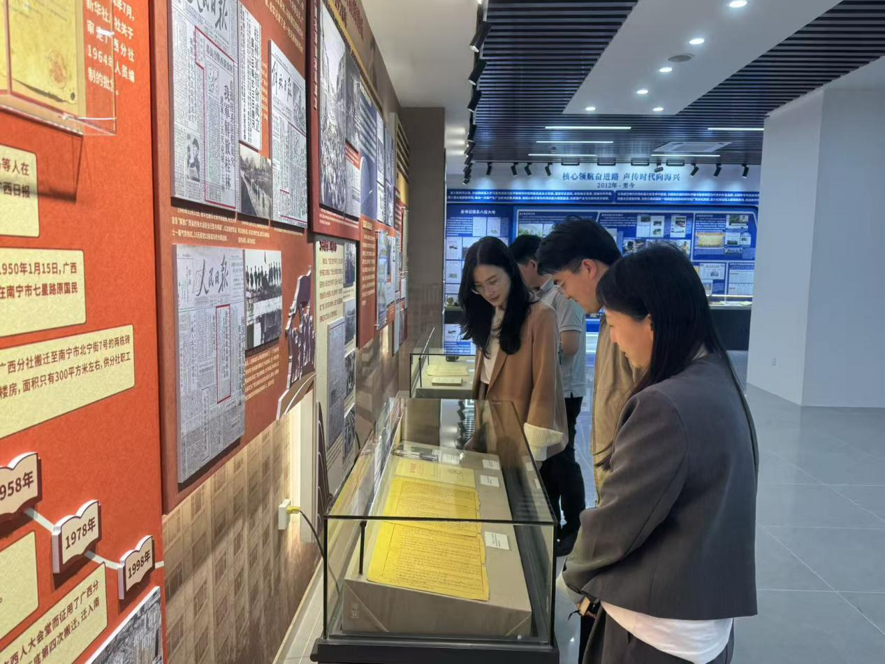 会后,学院一行在相关负责人陪伴下共同参观了新华社广西分社发展历程展厅。通过详细的图文资料、珍贵的历史文献等内容,深入了解了新华社广西分社自创立以来的光辉历程、重大报道成果以及在新闻传播领域作出的突出贡献。