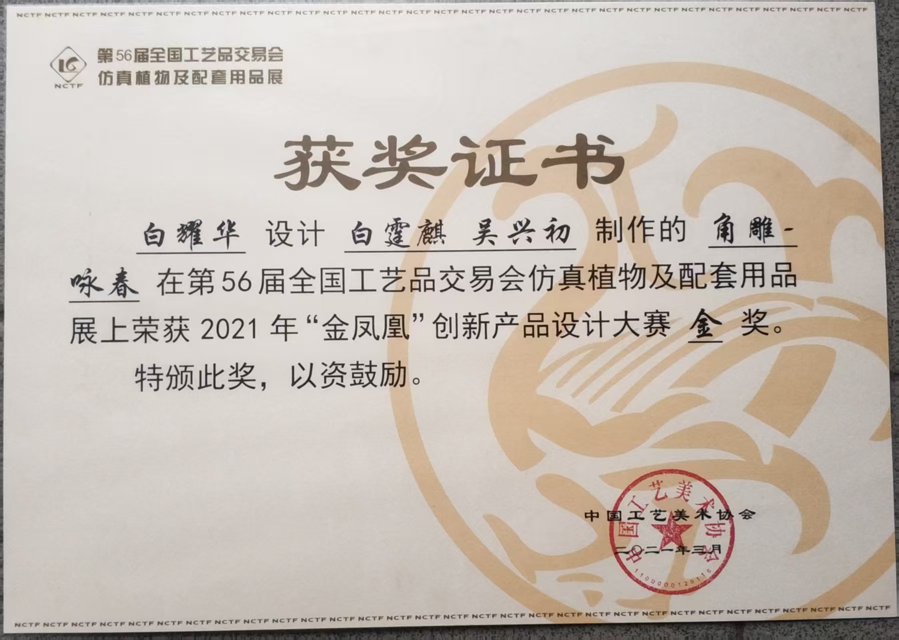 多年来,白耀华在全国工艺美术大赛中屡获殊荣,成为合浦角雕的杰出代表。2012年以来,他每年创作的作品都在大赛中斩获国家级金银奖,其中荣获6次国家级金奖、5次国家级银奖、2次国家级铜奖。他的代表作《中国梦》《和鸣百财》《花好月圆》分别在2014年、2016年、2018年全国工艺美术大师精品展“百花杯”上荣获金奖。这些荣誉不仅是对白耀华个人技艺的高度认可,更为合浦角雕在全国雕刻艺术领域赢得了一席之地,让这门古老的技艺焕发出新的光彩。