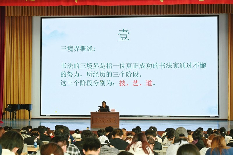 10月27日上午,陕西三秦书画研究院常务副院长李和生教授莅临我校,在西校区大礼堂为学校师生带来了一场题为《书法三境界》的专题讲座。讲座采用“理论阐释+技法解析”的模式,李和生教授以严谨清晰的逻辑框架与深厚的文化底蕴,从多重维度深入剖析书法艺术本质,为在场师生搭建起认知书法艺术的新视角,传递深刻思想启迪,引发广泛共鸣。