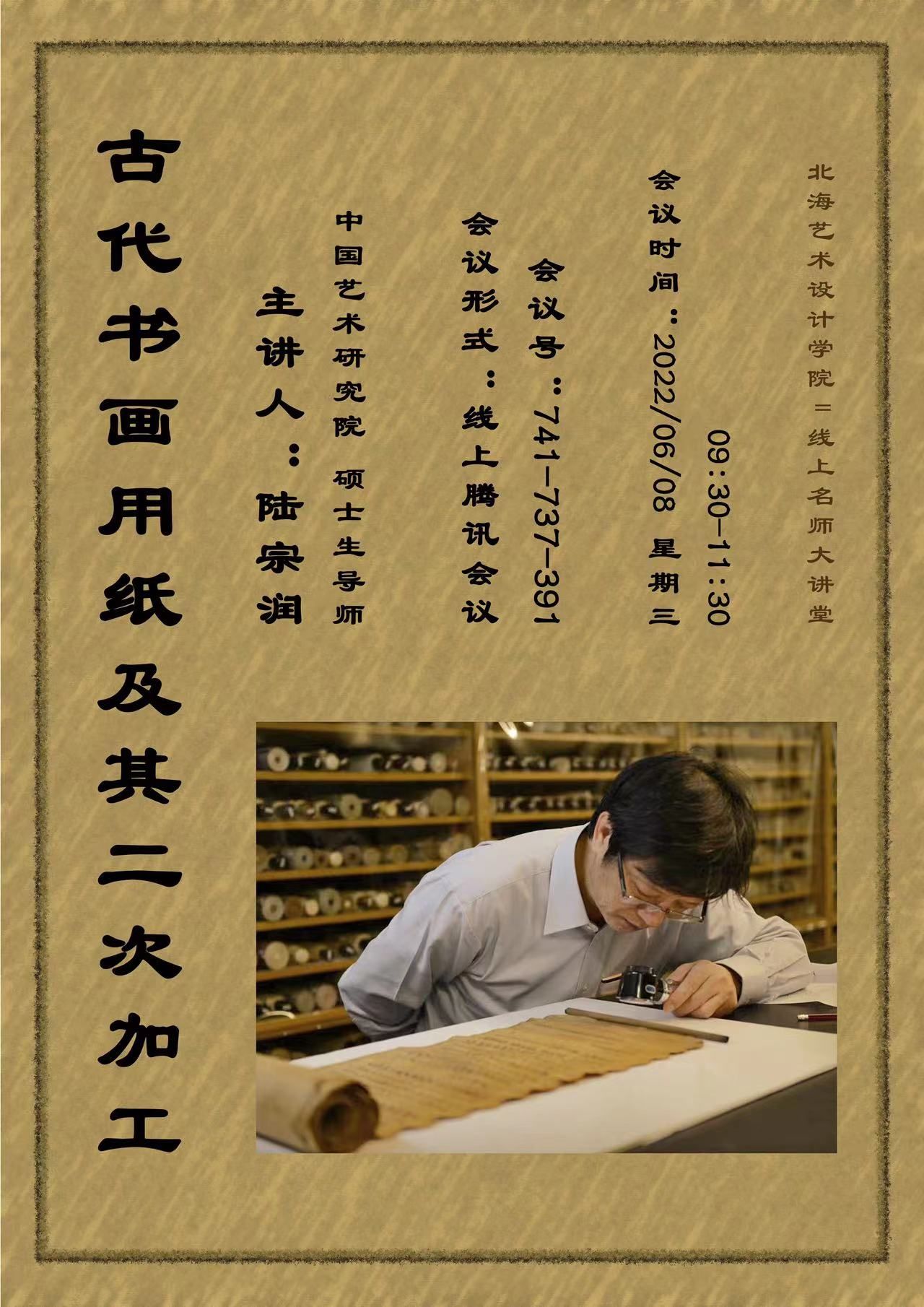 6月8日,美术学院邀请古书画修复大师陆宗润老师开展了题为《古代书画用纸及其二次加工》的讲座,全院师生以线上、线下形式参与其中。