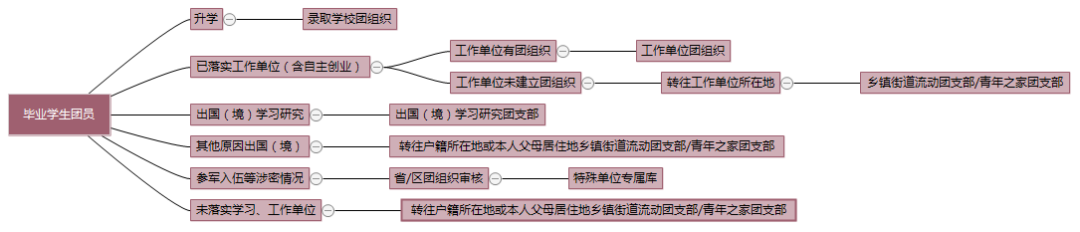 毕业生团员个人通过“智慧团建”系统申请将团组织关系转至工作单位团组织工作单位尚未建立团组织的,应转接至工作单位,所在地的乡镇街道“学社衔接临时团支部”。如因乡镇街道团(工)委书记空缺等原因,乡镇街道团组织接收确有困难的,从9月份起,应当由县级团组织直接建立“学社衔接临时团支部”承担接收责任。