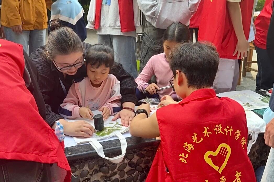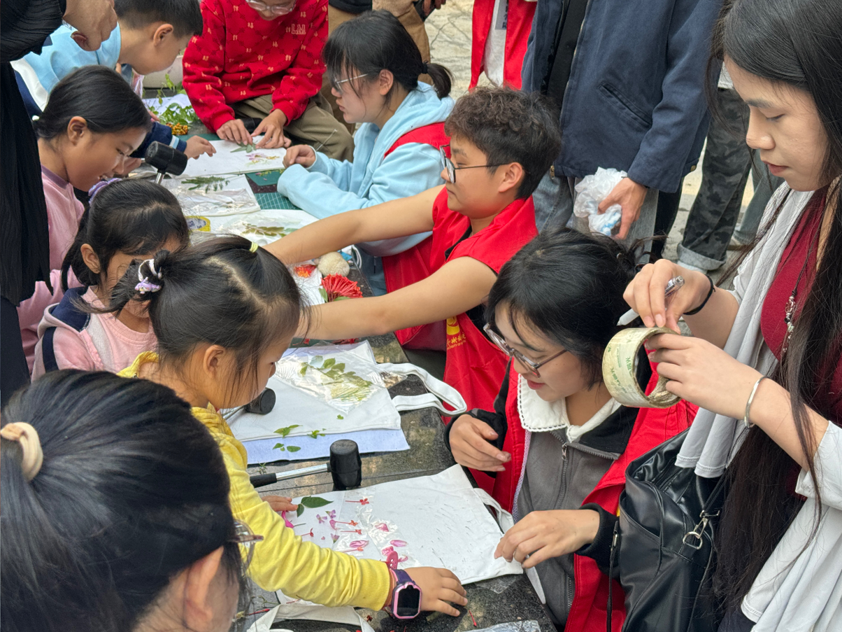 活动设植物拓染手工体验区、漆扇创作手工体验区及社区志愿服务工作组,志愿者们分工协作,保障活动高效推进。两大体验区开放后迅速成为居民参与热点,志愿者贴心提供创作材料,助力参与者完成作品。服装学院团总支书记陈琛还现场开展植物拓染技艺教学,带领大家感受传统手工艺的文化魅力。不少亲子家庭积极参与,在创作中收获乐趣与成长。